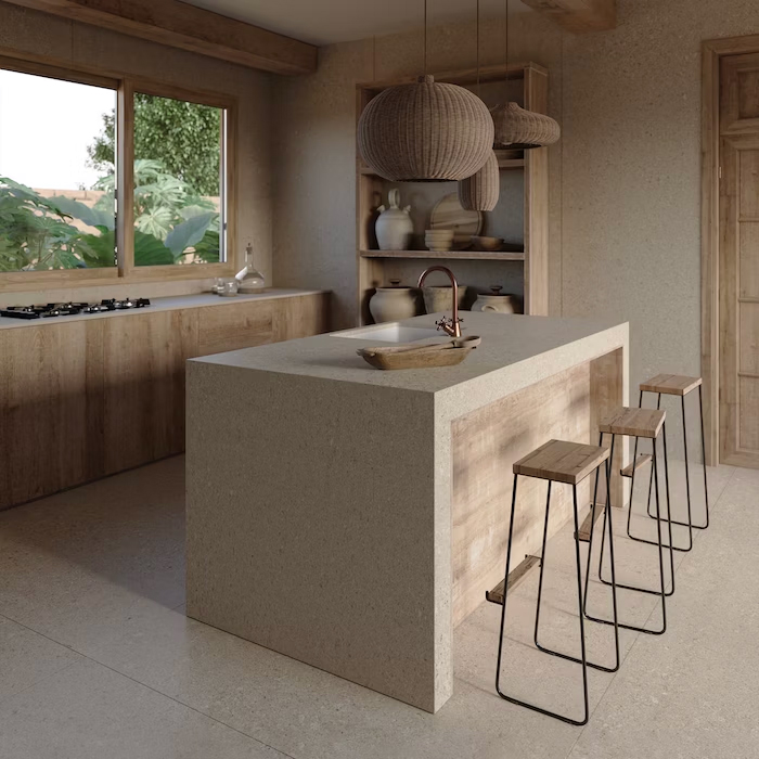With a light beige shade and an extremely natural finish, VK02 Avorio is inspired by the eponymous Avorio stone, an Italian material characterized by fossil shells. Its design makes it particularly suitable for applications requiring pattern continuity at the edges.